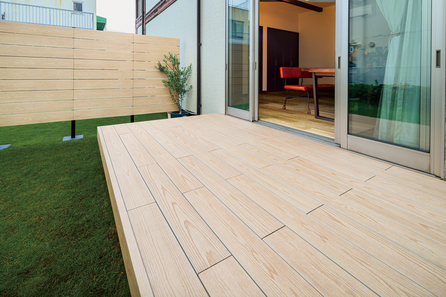 しかし、奥様は「ウッドデッキは初めは綺麗で良いが、使っているうちに劣化してしまうから人工芝で良い」というご意見だったそう。ご主人はさまざまな建材を調べ、彩木の存在を知り奥様に紹介します。