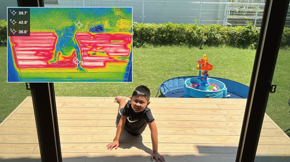 ※写真は夏35℃直射日光時、表面温度42℃で子供が裸足で外に出ることができる